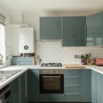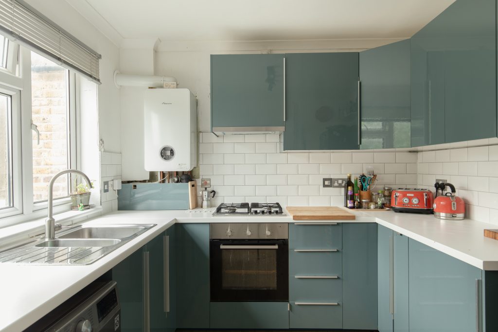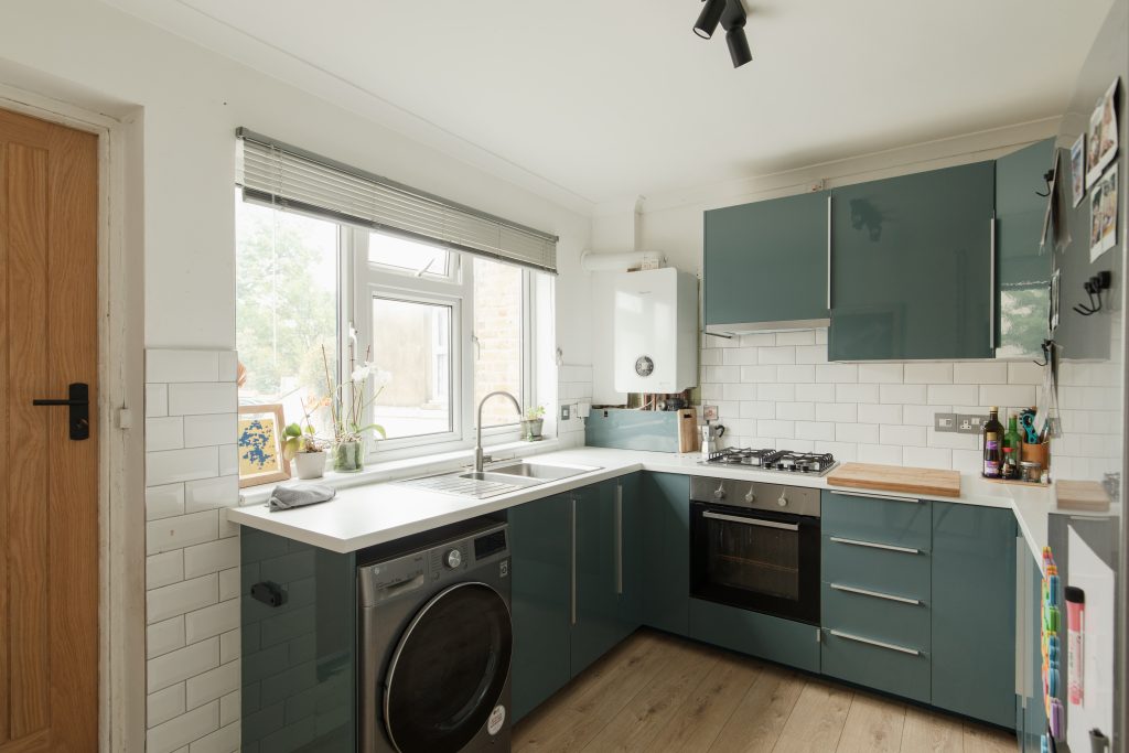 Next door is a smart U-shaped kitchen, with high-gloss modern units and brick-style tiling. Open a back door here and take stairs down to your own garden - a good size, and which is laid to lawn.
