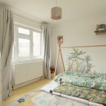 The rear bedroom is over 11 feet by over 9 feet, again with stripped and painted boards.