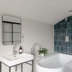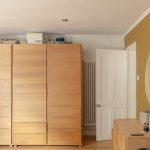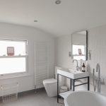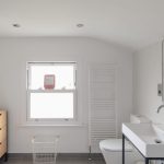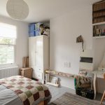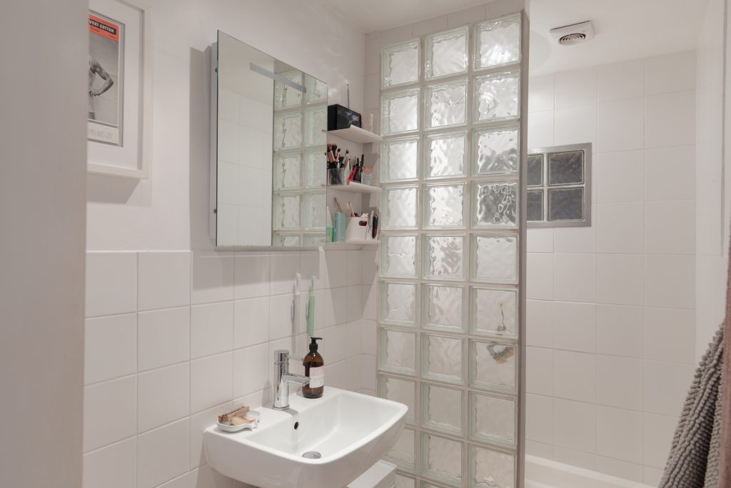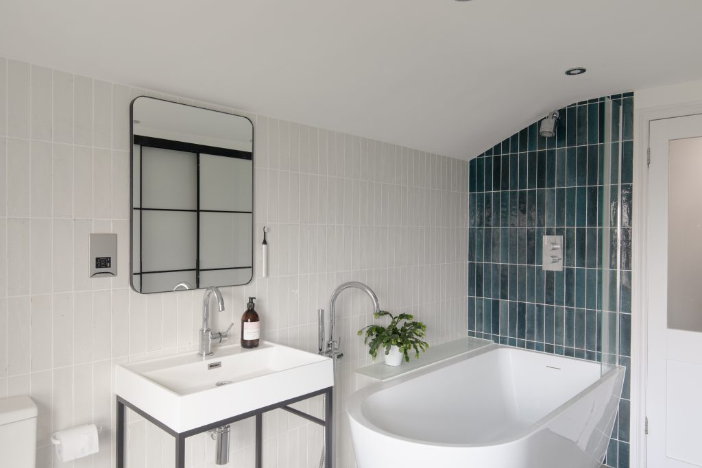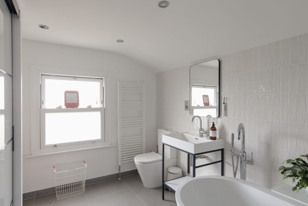 Up to the first floor and from the half-landing (with space for a desk), you’ll find your bathroom. This has a modern white suite with over-bath shower, and a large built-in cupboard for towels, toiletries and stuff.