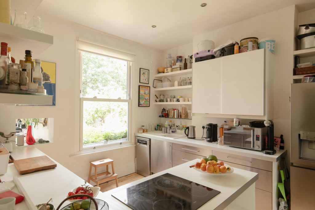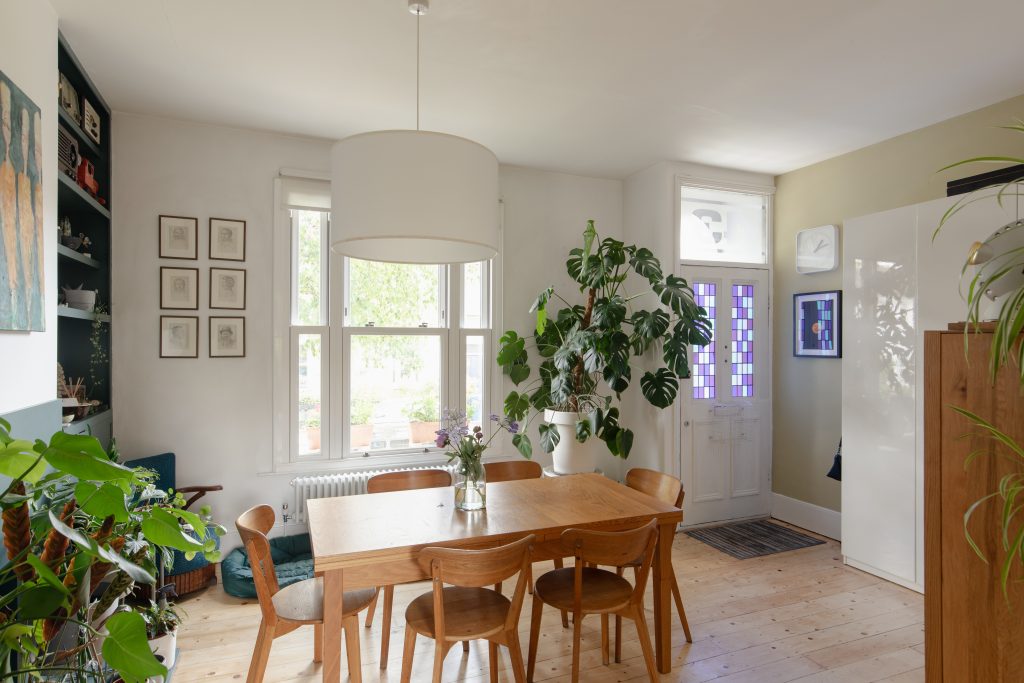Your front door is at raised ground floor level. You open directly into the big and bright dining space, of over 17 feet by over 12 feet (if you preferred, this could be your sitting room). This is open-plan to the modern fitted kitchen. This has cool stainless steel fronts. Sash windows face east and west, so you get good light throughout the through-room, all day long.